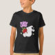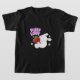Um coelho branco está segurando um morango vermelho. Ao redor do coelho segurando o morango estão pequenas flores brancas com centros amarelos. Esta design tem um estilo bonito e divertido, adequado para aqueles que amam adoráveis motins animais