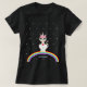Camiseta com um kitticorn fofo sobre um arco-íris em um fundo estrelado.