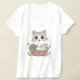Gato ilustrado encantador com bola de fio, sentado em um cesto de flores — perfeito para um roupa de conforto e capricho para amantes de os animais e artesãos.