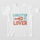 A design de t-shirt apresenta o texto "Lobster Lover" numa letra divertida, escrita à mão, rodeada de ilustrações coloridas, brancas, com temas de lagosta, como bolhas, algas e conchas. A design geral transmite uma sensação de diversão e alegria, celebrando o amor da lagosta e do oceano.