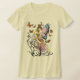 Uma fada loira com asas rosa e azuis. A fada está vestindo uma roupa fofa com um chapéu de cima, corset e estocagem estriada, Borboletas, relógio, engrenagens e design tribal num pano de fundo amarelo-claro.