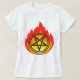 Ce design frappant présente une composition puissante et symbolique. Au centre, un pentagramme inversé, étoile à cinq branches pointant vers le bas, est inscrit dans un cercle noir. Cette forme géométrique audacieuse est placée devant un fond stylisé de flammes.