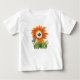 Esta camiseta infantil apresenta um design de leão de desenho animado fofo com sobreposições de grama e flores. Há também uma borboleta azul. Esta camiseta com design de animal seria um presente atencioso para chá de bebê ou novo bebê.