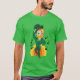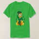T-Shirt masculina com uma Ilustração de um duende sorridente e alegre dançando vestindo um terno verde, uma gravata de arco e um chapéu de boliche; com notas pretas e um arco-íris amarelo e laranja no fundo. Uma design perfeita para celebrar o Dia de São Patrício!