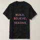 O slogan da Música Lyrics T-Shirt "Build, believe, Become" está escrito em negrito, sans-serif. As palavras estão empilhadas verticalmente, com "Construir" no topo, "Acreditar" no meio e "Tornar-se" no fundo. Esquema de cores: A t-shirt apresenta um fundo gradiente que transita de um azul profundo para uma tartaruga mais leve. O texto é escrito em branco para máxima visibilidade.