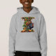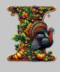 The design is a vibrant and festive representation of Thanksgiving, combining seasonal autumn elements with a playful cartoon turkey. At the heart of the image, the letter "I" stands out, adorned with vibrant leaves, pumpkins, and acorns, evoking a delicate autumnal atmosphere. Beside the letter stands a charming cartoon turkey, adding a touch of fun and personality to the design.