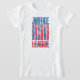 Este gráfico patriótico da Liga da Justiça é pintado em azul e vermelho, os membros da Liga se posaram em faixas de cores alternadas entre o logotipo do filme da Liga da Justiça.