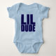 LIL DUDE em letras grandes azuis é excelente como um conjunto correspondente de Padre & Son de DUGE e LIL DUDE. Esta combinação faz um presente excelente/Filho, presente de Dia de os pais, presentes de Natal e muito mais. Obtenha roupa correspondente para os rapazes e seus Pais! Disponível em bebês.