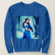A camisola ilustrada por uma jovem de vestido azul fica em uma floresta nevada, segurando um corvo. A cena é serena, com mais dois corvos voando ao fundo contra um pano de fundo de árvores negras e um céu de crepúsculo.