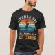 Esta t-shirt preta apresenta um gráfico circular retrô-estilo com um pôr do sol listrado em tons de laranja, amarelo e azul. Uma silhueta de um capataz trabalhando em um polo de força está centrada dentro do círculo, flanqueada por árvores. O texto "PAI LINEMAN" é curvo acima do gráfico e "COMO UM PAI NORMAL APENAS REFRIGERANTE" é exibido abaixo em uma combinação de fontes brancas e amarelas.
