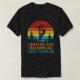 Esta t-shirt preta apresenta um gráfico circular retrô-estilo com um pôr do sol listrado em tons de laranja, amarelo e azul. Uma silhueta de um capataz trabalhando em um polo de força está centrada dentro do círculo, flanqueada por árvores. O texto "PAI LINEMAN" é curvo acima do gráfico e "COMO UM PAI NORMAL APENAS REFRIGERANTE" é exibido abaixo em uma combinação de fontes brancas e amarelas.