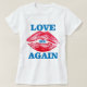 Um gráfico brilhante com um par de lábios negrito e vermelho marcados com batom no centro. Ao redor dos lábios estão as palavras AMOR no topo e NOVAMENTE no fundo, ambas em letras grandes e vibrantes azuis. A palavra ME é colocada no meio dos lábios em branco, criando um contraste impressionante. O fundo é branco claro, melhorando o impacto visual geral.