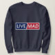 A clean and modern typography design featuring the bold phrase “LIVE MAD” in a stylish split‑color layout of navy blue and red. This minimalist streetwear‑inspired graphic is perfect for T‑shirts, hoodies, phone cases, stickers, and lifestyle accessories. With its sharp lines, strong contrast, and contemporary aesthetic, it delivers a confident and energetic look that appeals to fans of motivational, bold, and urban‑style designs. Ideal for everyday wear or gifting to someone with a fearless attitude.