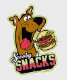Veja este logotipo do estilo do adesivo retrô para Scooby Snacks, com Scooby-Doo comendo um hambúrguer.