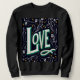 A bold floral-letter design featuring the word Love in green-teal shadow on navy, surrounded by white vines and tiny orange blossoms. Distinctive, vintage-inspired typography for apparel.