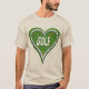 A grama verde e as bolas de golfe formam um coração pontilhado com camisetas, e as armadilhas de sans soltam o nome do jogo, GOLF.