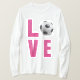 Love Soccer word design com letras faíscas cor-de-rosa quente e o "o" é substituído por uma bola de futebol.