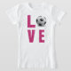 Love Soccer word design com letras faíscas cor-de-rosa quente e o "o" é substituído por uma bola de futebol.