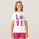 Love Soccer word design com letras faíscas cor-de-rosa quente e o "o" é substituído por uma bola de futebol.