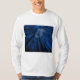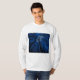 Esta design apresenta uma bela imagem de uma lua de cheio atrás de árvores altas. O céu é azul escuro.
