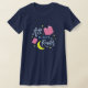 Um design de livro com as palavras "All Night Reader" cercado por lua amarela e estrelas e livros cor-de-rosa que parece excelente contra uma camiseta cor escura. *Observe que a Marca d'água do Zazzle que aparece na visualização de zoom NÃO aparecerá no produto impresso final. © Bookish e Maravilha
