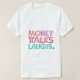 Um design de camiseta colorida com a declaração em negrito "MONKY TALKS LAUGHS" numa letra vibrante e multicolorido,