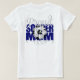 Camiseta com a Mãe de Futebol Orgulhoso na parte de trás em letras azuis; personalizada na área de bolso da frente com o nome da mãe ou da criança que começa com a letra "R".