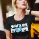 Uma adorável camiseta feminina para mães de natação orgulhosas para vestir a natação e mergulho, encontros e práticas, com a NATAÇÃO MOM impressa na frente e um grande gráfico nadador em forma de coração no lugar do O com legal água piscina azul no fundo.