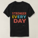 Um design de camiseta vibrante com a frase "Mais Forte Todos os Dias" em tipografia ousada e multicolorida. O texto é arranjado num esquema dinâmico e atraente, com cada letra a irradiar uma matiz energética diferente. O design geral transmite uma sensação de força, resistência e crescimento positivo.