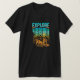 Um design captivador mostrando uma vista de montanha em camadas através de painéis estilizados, mostrando caminhadas, acampamento e aves em chamas sob um sol brilhante. Ela incorpora o espírito da aventura e o chamado da natureza