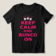 Fique calmo e Bunco ligado! Sabe o que queremos dizer! Camiseta Bunco divertida. Você é um jogador do Bunco duro que quer apimentar sua roupa noturna? Não olhe mais! Veja esta na moda e confortável camisa Bunco com uma combinação única de rosa, preto e branco. Você não só ficará fabuloso enquanto toca, como também pode vestir como um prêmio bonito ou um presente pensativo para outros amantes do Bunco. Não perca essa roupa!