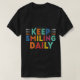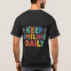 A t-shirt apresenta a mensagem "Mantenha o Sorriso Diário" numa série de cores brilhantes e alegres. Cada palavra é uma matiz diferente, criando uma vibração lúdica e otimista. O texto em si tem uma fonte limpa e em negrito para facilitar a leitura contra a cor sólida da t-shirt.