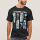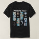 Este vestuário preto apresenta quatro painéis verticais que mostram ilustrações vibrantes do estilo aquarela da vida marinha e temas náuticos. Uma âncora com peixes e flores, um veleiro, vários peixes com conchas e golfinhos e um farol com corda são representados. O texto "MARINE VIBES" é impresso no topo. É uma design viva para aqueles que amam o oceano.