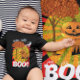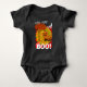 Camiseta fácil para fantasia de Halloween ou festa da colheita para o bebê. Ótimo para a festa da sua igreja! Família de abóboras fofas em pé ao lado de uma árvore com folhas de outono laranja em uma camiseta. Lua e nuvens brancas com uma família de abóboras de Halloween sorridentes e amigáveis com um BOO! amigável. Com olhos engraçados no topo de cada letra grande! Fundo com listras gráficas vermelhas e amarelas. meio que parece um design de bandeira do sol japonês