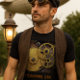 Personalize esta camisa steampunk com seu próprio texto. Esta camisa com as engrenagens de relógio industriais e acabamento de couro preto falso foi projetada para ele e faria um ótimo presente de aniversário ou por qualquer motivo.