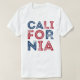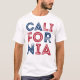 Camiseta branca masculina com lettering estilo grunge da Califórnia em design vermelho e azul.