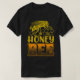 Esta camiseta preta apresenta uma ilustração detalhada e ouro de uma abelha de mel posicionada acima das palavras "ABELHA DE MEL". A palavra "MEL" é escrita em uma fonte estilizada de ouro, enquanto "MEL" está em uma fonte esboçada em negrito, laranja com um preenchimento de padrão de mel. Um sutil pano de mel completa a design.