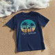 Esta camiseta festiva de Natal no Havaí apresenta um pôr do sol de uma praia tropical sobre um fundo azul legal com um desenho de palmeiras costeiras contra um pôr do sol à beira do mar. Mele Kalikimaka escreveu em tipografia cursiva nesta bonito tenda de férias.