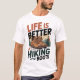 Esta roupa branca apresenta o texto aventureiro "LIFE IS BETTER in Hiking Boots" em fontes arrojadas e cursivas. Uma ilustração de botas de caminhada castanho resistente é colocada contra um cenário de montanhas e pinheiros, sugerindo um amor pela exploração ao ar livre e pela natureza. Perfeito para caminhantes e aventureiros.
