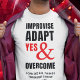 Na moda IMPROV T-Shirt com uma redação que diz IMPROVISE ADAPT YES & OVERCOME, que é uma combinação de uma frase motivacional popular com o "Sim E", que é a principal regra de improviso. Presente motivacional ideal para pessoas que também adoram teatro improvisado ou que são comediantes de stand-up. Design apresenta tipografia em negrito e vermelho. Na parte inferior, há um TEXTO CRISTÃO PERSONALIZÁVEL baseado nos Philippians 4:13, que se ajustado bem com esta citação inspiradora. Presentes correspondentes também disponíveis.