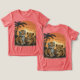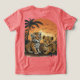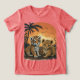 Esta imagem encantadora mostra dois filhotes adoráveis, um tigre e um leopardo, brincando juntos em uma selva exuberante. O pôr do sol vibrante e a palmeira criam uma atmosfera tropical, enquanto os filhotes brincalhões simbolizam a inocência e a alegria da infância.
