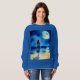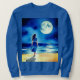 Sweatshirt em uma ilustração de uma jovem solitária, vestida de azul à beira de uma praia, a olhar para a lua de cheio refletindo no oceano. O céu noturno sereno está pontilhado de estrelas.