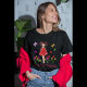 Menina vestindo um vestido vermelho. Ela está caminhando no jardim entre lindas flores e borboletas coloridas. Para mais personalização, basta clicar no botão "Editar" ou "Personalizar" e usar nossa ferramenta design para modificar este modelo. Escolha o seu tamanho e cor e, em seguida, ADICIONE AO CARTÃO e coloque o seu pedido
