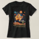 Um gato espacial em um traje astronauta flutua sobre Marte com OVNIs, peixes ouros, Júpiter e Netuno nas proximidades. Colagem surreal com a citação: "No espaço, ninguém pode ouvir você miau... mas a alienígena entende."