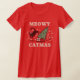 Ilustração retrógrada com design de texto "Meowy Catmas" e gato preto giro, árvore de Natal, flocos de neve, presentes, patas e estrelas decoração