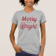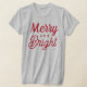 A festive Christmas graphic tee for women featuring modern lowercase script typography with "Merry and Bright" saying. Red text and tshirt style can both be modified.