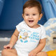 Uma roupa bonita para bebê em azul pastel escrevendo para a Páscoa de uma rua de um bebê personalizada com o nome do seu filho. Imagem adorável de uma criança vestida de macacão com um coelho junto a um pintinho por www.prettygrafik.com