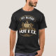 Esta camiseta preta apresenta um design com o tema do café com o texto "MY BLOOD TYPE IS" gravado acima de uma ilustração de xícara de café a vapor. A palavra "COFFEE" aparece de forma destacada abaixo em uma fonte ousada e estilizada com sotaques decorativos de café. A design sugere humoramente uma forte afinidade pelo café.