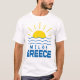 Aproveite este verão com esta camiseta branca dos homens, luz de sol Grécia e ondas marítimas. Esta design azul e amarela apresenta luz do sol e ondas de água com Milos em letra estilo grego com uma grande Grécia azul. Vista esta camiseta enquanto estiver nesta bela ilha grega ou dê-la como um presente ou lembrança excelente.