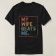 Este design apresenta uma camiseta preta com o texto "MY WIFE BEATS ME" em uma fonte estilizada. As palavras são empilhadas verticalmente e inseridas dentro de uma borda fina e retangular.